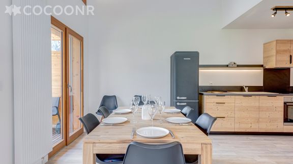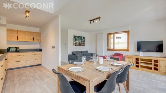 - Cuisine ouverte sur le séjour entièrement équipée avec : lave-vaisselle, four, réfrigérateur, plaques de cuisson, cafetière Senseo, appareil à raclette, vaisselle et couverts...