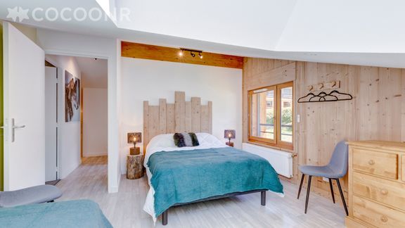 - Chambre parentale avec lit double (140 cm x 190 cm), petite table et 2 assises.