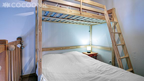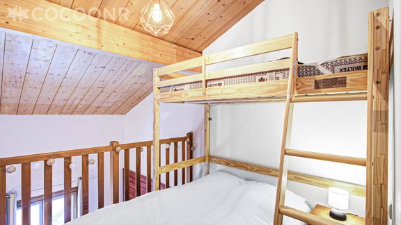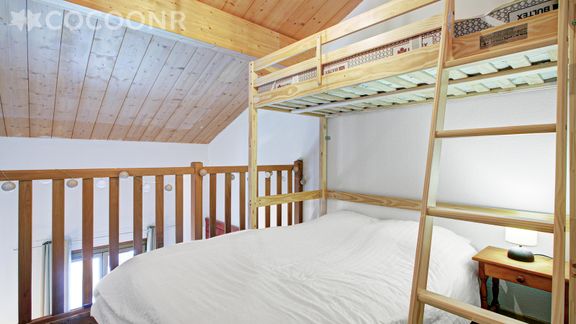 - Une mezzanine avec un lit superposé (un lit double en bas et un lit simple en haut)
