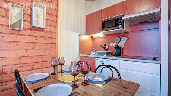 - Une pièce de vie lumineuse de 16 m² avec TV, canapé, espace repas et une kitchenette équipée avec notamment : four, four à micro-ondes, lave-vaisselle, plaques de cuisson...