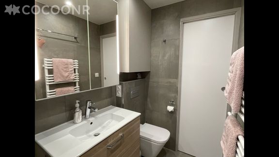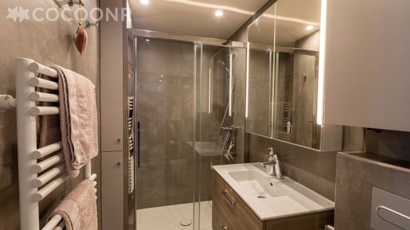 - Une salle d'eau entièrement équipée avec WC suspendu (douchette de toilette intime intégrée), douche à l'italienne à jets de douchettes réglables, vasque, miroir lumineux, sèche-serviettes, sèches-cheveux, produits de douche et shampoing...