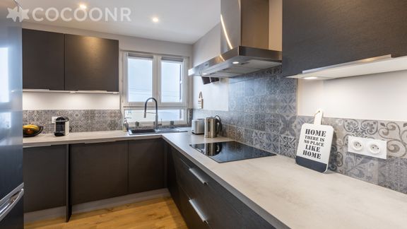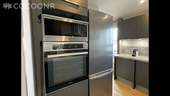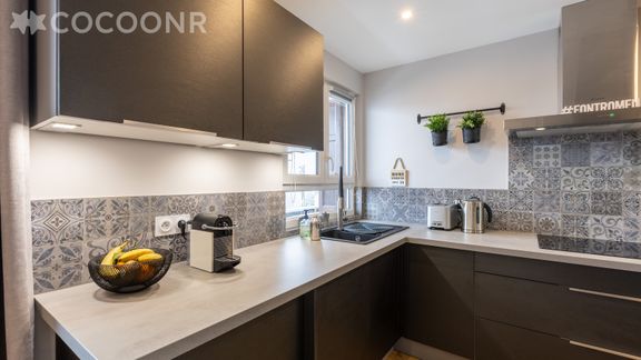 - Une cuisine entièrement équipée avec notamment : bouilloire électrique, four, four à micro-ondes, grille-pain, lave-vaisselle, plaques de cuisson à induction 3 points, hotte aspirante, réfrigérateur combiné congélateur, cafetière à dosettes Nespresso...
