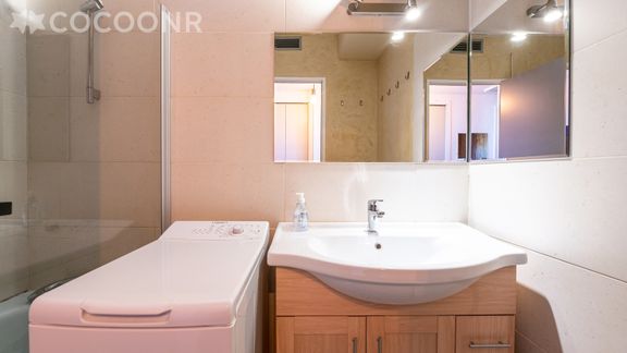 - Une salle de bain avec baignoire, meuble vasque, lave-linge