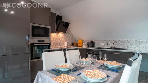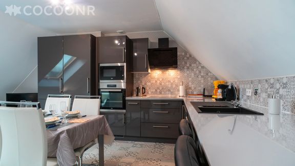 - Une cuisine équipée avec notamment : bouilloire électrique, four, four à micro-ondes, grille-pain, lave-vaisselle, plaques de cuisson...