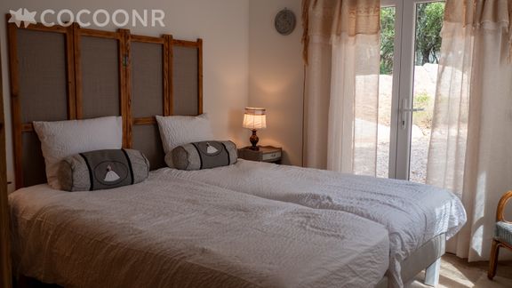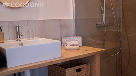- Chambre 1 : 2 lits jumeaux (90×200) rapprochés pour faire un lit double (180×200) ainsi qu'une salle de bain avec douche