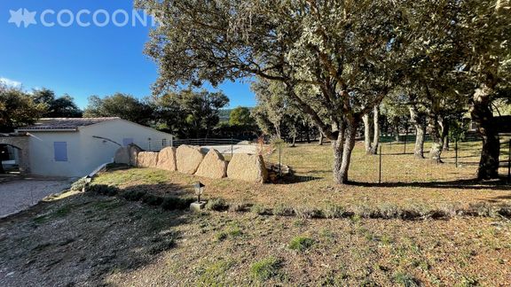 Grand terrain avec 3 maisons, un parking et un terrain de pétanque partagé. Les 2 petites villas sont clôturées, tandis que la grande villa est ouverte sur le terrain commun.