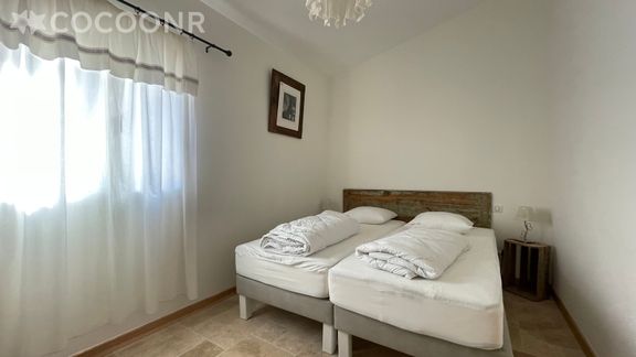 - Une chambre avec 2 lits jumeaux (90×200) pouvant être rapprochés pour faire un lit double (180×200) et armoire.