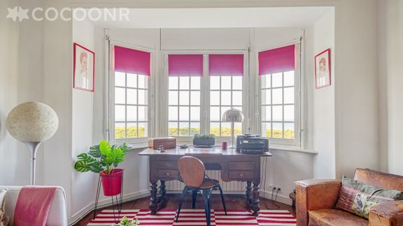 - Un grand espace bureau, face à la mer, aménagé avec canapé, fauteuil et table basse.