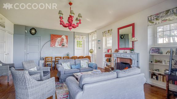 - Un salon aménagé avec deux canapés, deux fauteuils, une table basse, une TV, une cheminée, une table à manger et une vue incroyable sur la mer.