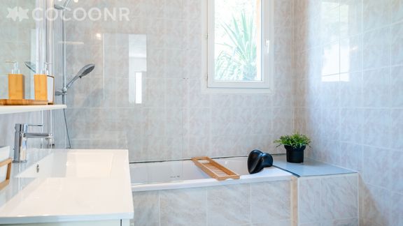 - Une salle de bain avec une baignoire, un lavabo, un sèche-cheveux.