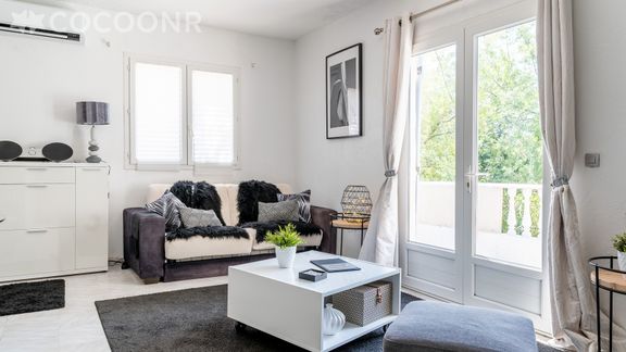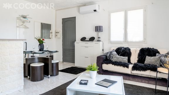 - Un salon séjour climatisé et aménagé avec un canapé, une table basse, une TV écran plat, ainsi qu'un espace-repas pour 4 convives.