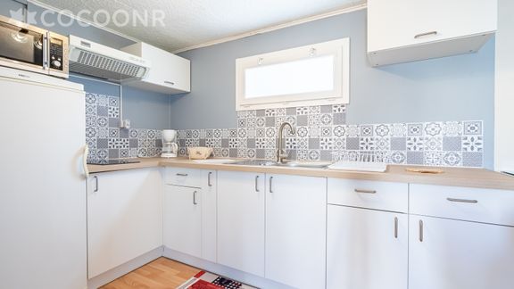 - Une cuisine ouverte équipée avec notamment : bouilloire, cafetière Tassimo, four à micro-ondes, plaques de cuisson, réfrigérateur...