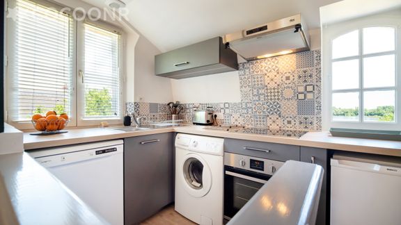 - Une cuisine ouverte équipée avec notamment : bouilloire électrique, four, four à micro-ondes, grille-pain, lave-vaisselle, plaques de cuisson à induction, cafetière à dosettes Nespresso...