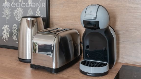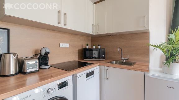 - Une cuisine équipée avec notamment : bouilloire électrique, four à micro-ondes, grille-pain, lave-vaisselle, plaques de cuisson...
