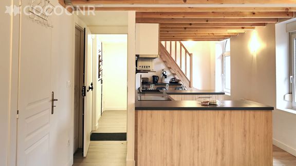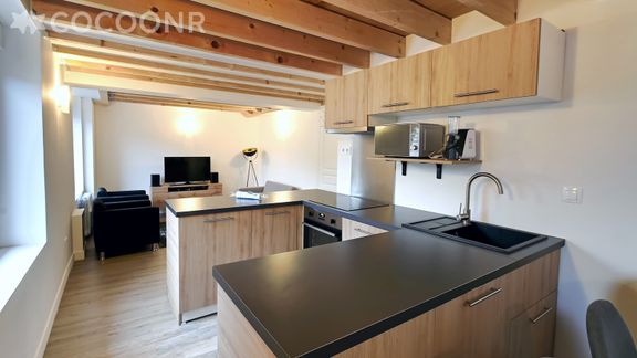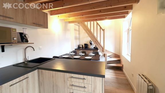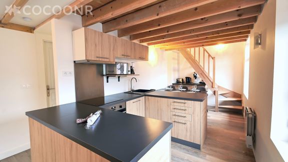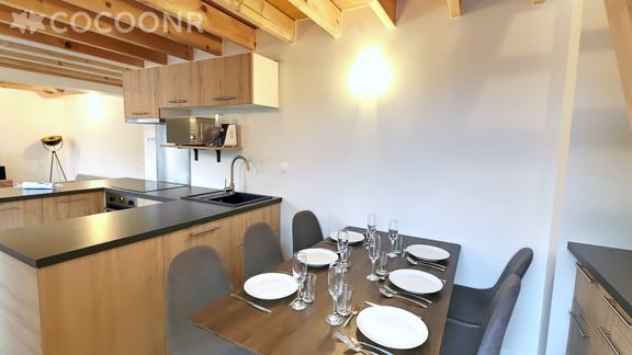 - Une cuisine équipée et ouverte sur le salon avec notamment : bouilloire électrique, four, four à micro-ondes, grille-pain, lave-vaisselle, plaques de cuisson, appareil à raclette...