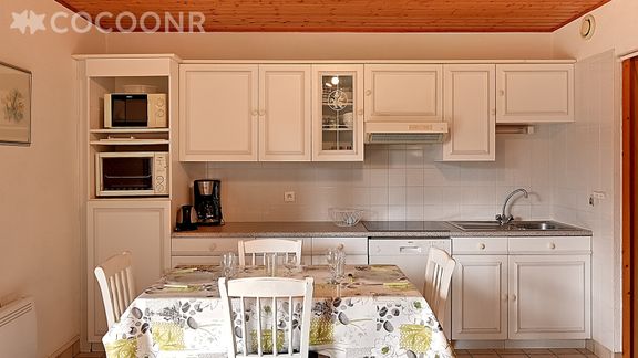 - Une cuisine équipée avec notamment : bouilloire électrique, four, four à micro-ondes, grille-pain, lave-vaisselle, plaques de cuisson...