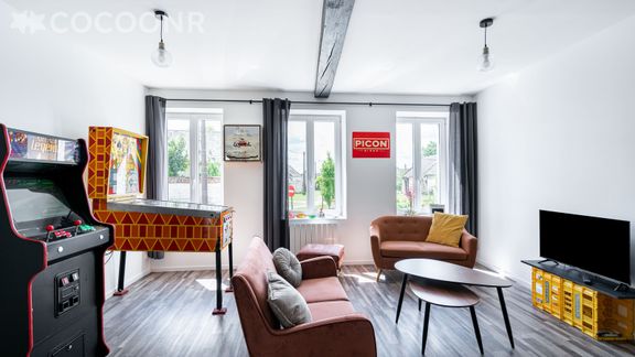 - Une pièce de vie exposée plein Sud de 25 m² avec TV, canapé, fauteuil et jeux d'arcades.