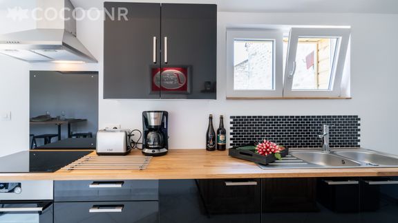 - Une cuisine équipée avec notamment : four, four à micro-ondes, grille-pain, lave-vaisselle, plaques de cuisson, bouilloire électrique, machine à café à filtre, cafetière dosette Senso ...