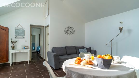 - Une pièce de vie de 30 m² avec TV et canapé lit.