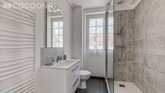 - Une salle d'eau avec une douche, une vasque, un sèche-serviette chauffant, et un WC.