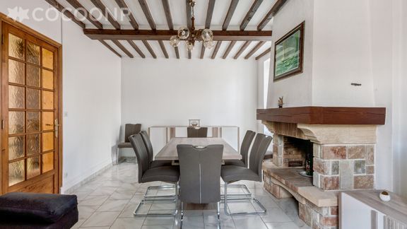 - Une belle pièce de vie lumineuse avec un coin salon doté d'un canapé, une table basse, une TV et une cheminée ainsi qu'un espace repas avec une table à manger pouvant accueillir jusqu'à 8 convives.