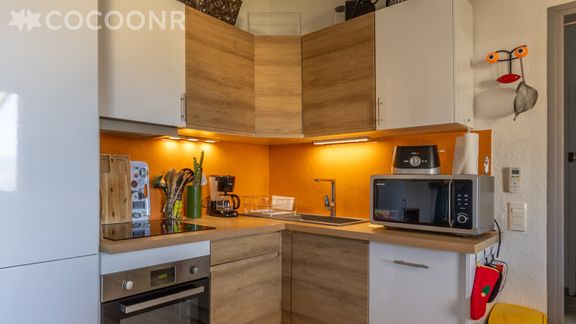 - Une cuisine équipée avec notamment : bouilloire électrique, four, four à micro-ondes, grille-pain, lave-vaisselle, plaques de cuisson...