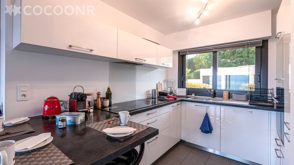 - Une cuisine ouverte et équipée avec notamment : cafetière Nespresso, bouilloire électrique, four, four à micro-ondes, grille-pain, lave-vaisselle, plaques de cuisson, appareil gaufre, blender etc....