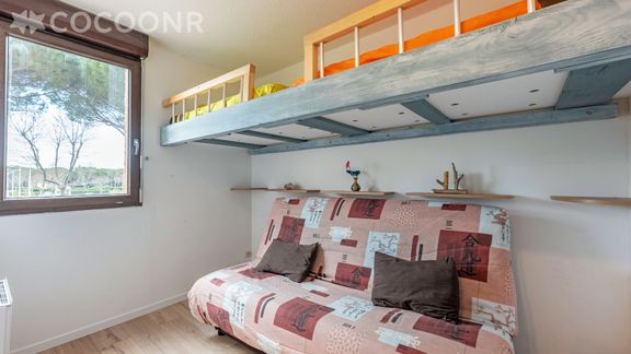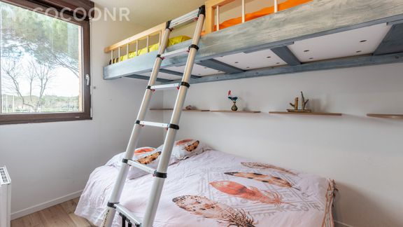 - Chambre 2 : Canapé convertible en lit double 140 x 190 cm avec un véritable matelas de 20 cm d'épaisseur. Lit mezzanine avec deux couchages enfants, accessibles par une échelle télescopique (2 vrais matelas sur-mesure 1,50 m x 1 m, installés pieds à pieds)