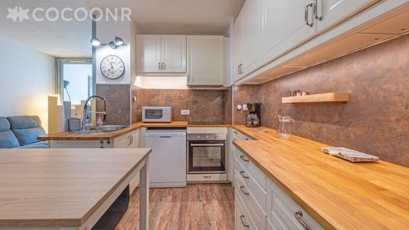 - Une grande cuisine aménagée : lave-vaisselle, four, plaque de cuisson vitrocéramique 4 feux, 2 cafetières (à filtre et une Senseo), hotte aspirante, four micro-ondes, divers plats...