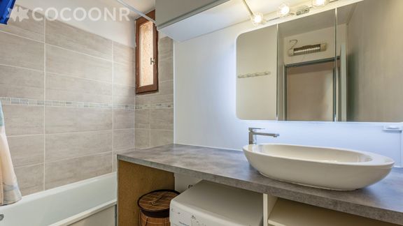 - Salle de bain avec fenêtre aménagée avec baignoire, lave-linge, placards