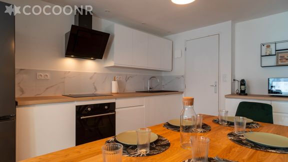 - Une cuisine équipée avec un espace repas et notamment : bouilloire électrique, four, four à micro-ondes, grille-pain, lave-vaisselle, plaques de cuisson...