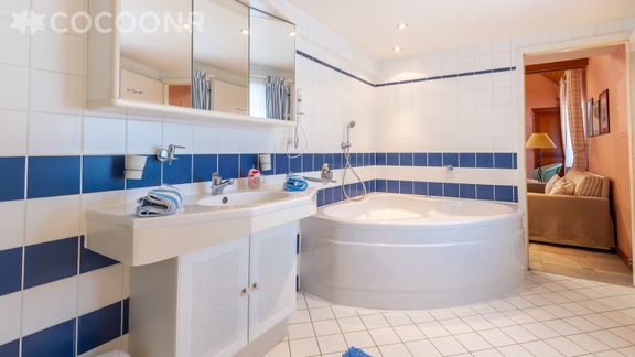 - Une salle de bain avec douche, baignoire jacuzzi et WC.