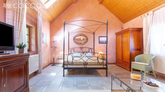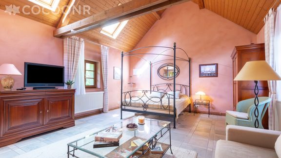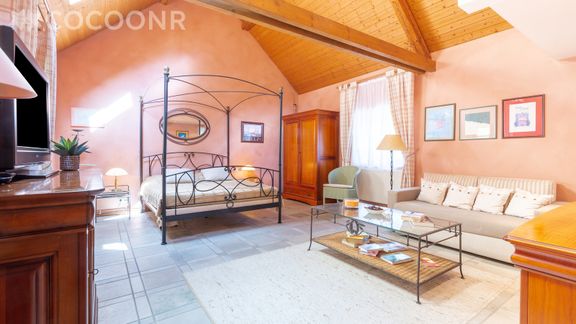 - Une pièce de vie qui est également la chambre de 20 m² avec TV, canapé convertible (1 place) et un lit king size à baldaquin (180×200).