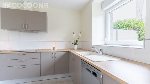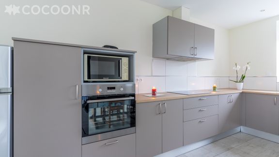 - Une cuisine équipée avec notamment : bouilloire électrique, four, four à micro-ondes, grille-pain, lave-vaisselle, plaques de cuisson...
