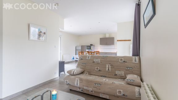 - Une pièce de vie de 35 m² avec canapé convertible, TV, cheminée et coin repas