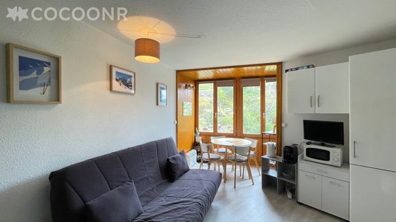 - Pièce à vivre lumineuse avec ses fenêtres vue sur la montagne aménagée avec canapé-lit, meuble et TV écran plat. L'espace salle à manger comprend quant à lui une table ronde et ses 4 assises.