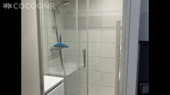 - Salle de bain avec douche, vasque et sèche-serviettes.