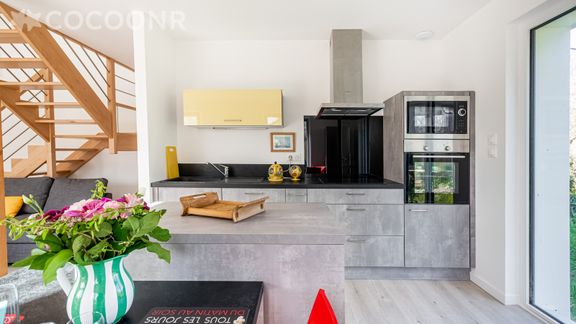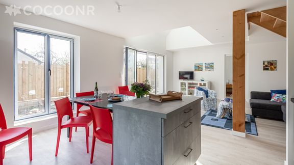 - Une cuisine moderne ouverte sur le salon, entièrement équipée : frigidaire congélateur, lave-vaisselle, four, plaques vitro-céramiques, micro-ondes, bouilloire, grille-pain, cafetière, etc..