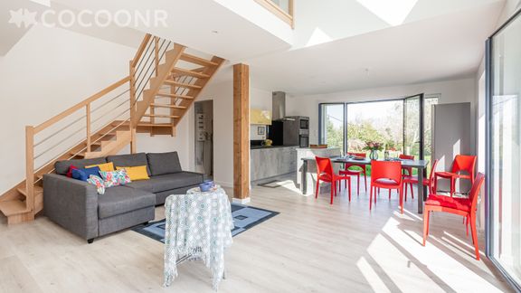 - Un grand séjour-salon aménagé avec un canapé-lit double, deux fauteuils, une table basse, une TV et une table à manger pouvant accueillir jusqu’à 6 convives. Cet espace dispose de trois grandes portes vitrées donnant accès à l'extérieur.
