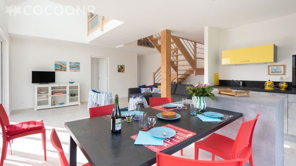 Après une journée bien remplie entre visite du bourg de la Grimpette, randonnées, baignades, pêche à pied et croisière en voilier, venez vous détendre et regagnez votre pied-à-terre. Cette maison neuve et spacieuse de 100 m² dispose d'un séjour-salon lumineux, d'une cuisine entièrement équipée, d'un cellier, de trois chambres, une salle d'eau, une salle de bain ainsi qu'une grande terrasse (72 m²) et mobilier de jardin.