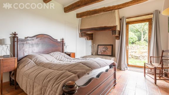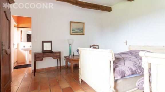 - Chambre 1 : un lit queen size (140×200) avec salle de bain privative avec baignoire et un WC.