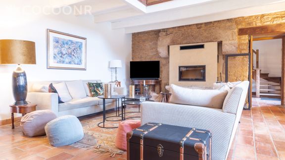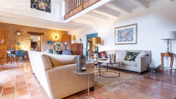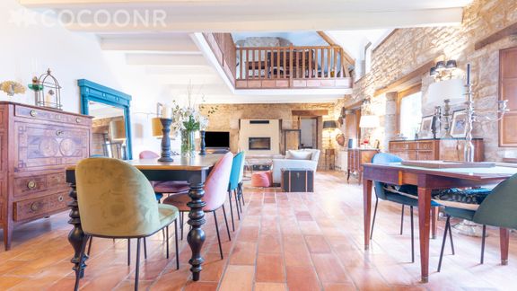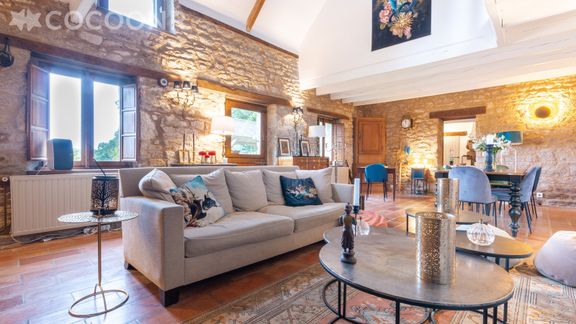- Une pièce de vie cathédrale de 48 m² avec canapés, cheminée (bois fourni), TV,..