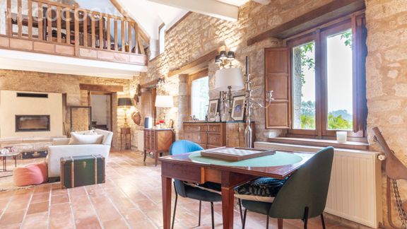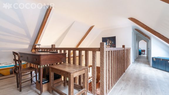 - Un espace bureau/bibliothèque en mezzanine surplombant le séjour.