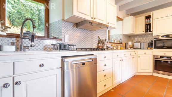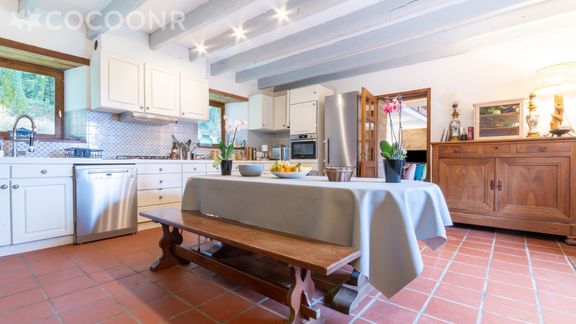 - Une cuisine équipée avec notamment : cheminée fonctionnelle, bouilloire électrique, four, four à micro-ondes, réfrigérateur, grille-pain, lave-vaisselle, plaques de cuisson, cafetière, et cafetière à dosettes Nespresso...