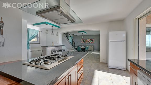 - Une cuisine équipée avec notamment : bouilloire électrique, four, four à micro-ondes, grille-pain, lave-vaisselle, plaques de cuisson...