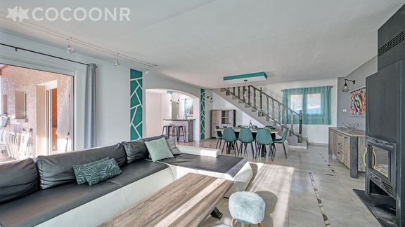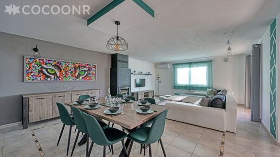 - Une pièce de vie de 60 m² avec canapé, TV, coin repas et cheminée (bois en supplément)