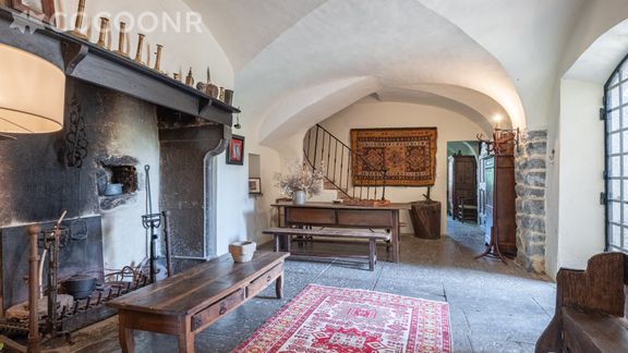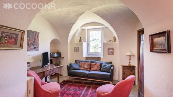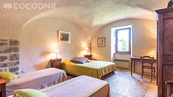 - Une grande pièce voutée avec petit salon (TV , quelques jeux), cheminée (bois non fourni), table, ainsi qu'une petite pièce attenante avec un lit.