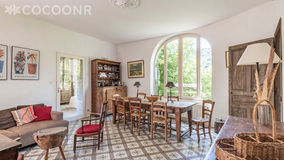 Nous vous proposons à la location, sur la commune de Joyeuse, cette grande demeure mitoyenne, spacieuse, confortable et pleine de charme, typiquement Ardéchoise.Vous serez séduits par sa situation exceptionnelle au bord d'une belle rivière où vous pourrez vous baigner, nager, naviguer, pêcher. Idéale en famille ou entre amis, ce logement de 190 m² peut accueillir jusqu’à 13 voyageurs (confortable pour 10 adultes et 3 enfants). Elle est composée de deux pièce à vivre dont une avec cheminée, l’autre avec une cuisine ouverte, de cinq belles chambres et deux salles de bain. Vous pourrez aussi profiter d’un grand jardin et de deux terrasses, l’une abritée pour les repas en extérieur, l’autre en plein soleil avec vue sur la rivière.