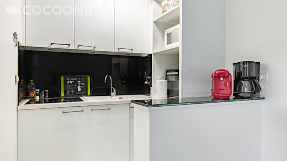 - Une cuisine équipée avec notamment : bouilloire électrique, four, four à micro-ondes, grille-pain, lave-vaisselle, plaques de cuisson...