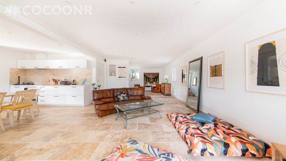 - Une pièce de vie de 100 m² avec canapé, TV, coin repas